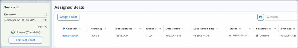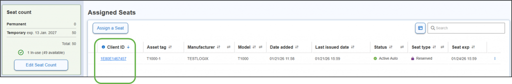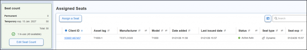 Back in the 'License Details' dashboard in SmartHub the newly licensed device appears in the list of assigned seats as shown below. If it is not visible, try refreshing the browser page on the computer hosting SmartHub.