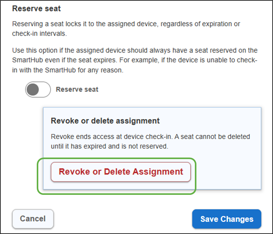 - Reserved seats continue to occupy a license seat until they are explicitly unreserved and deleted from the Assigned Seats list in SmartHub.