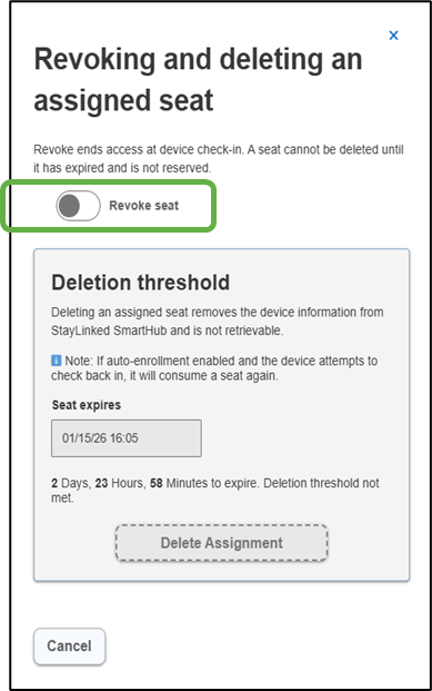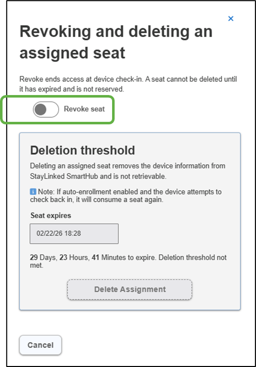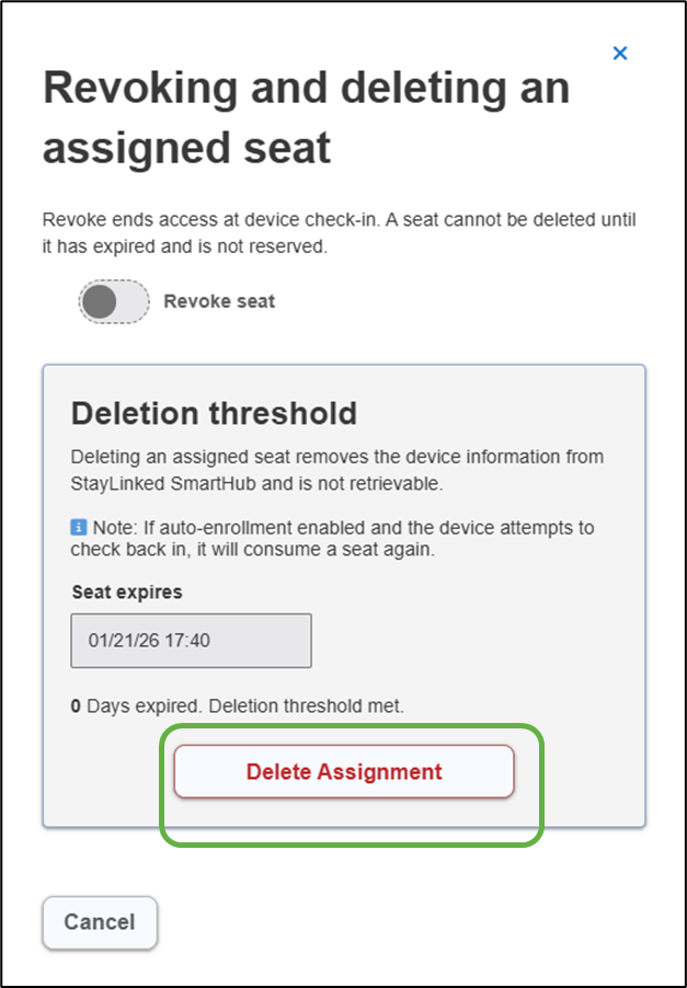 - After the seat reaches its expiration date, the administrator can delete the assigned seat from SmartHub.