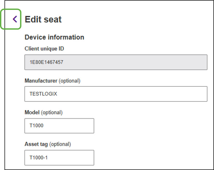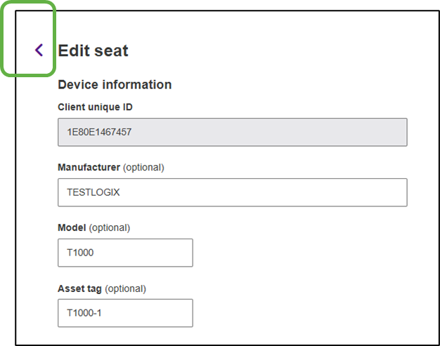 The ‘Edit seat’ pop-up menu is where the behavior is configured for a single mobile device/seat. Client ID, Manufacturer and Model are pre-filled. Manufacturer and Model can be edited. Asset tags are common on mobile devices, and we have entered ‘T1000-1’ for this one.