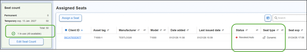 Back in the ‘License Details’ dashboard, once the browser window is refreshed, our device status has changed from ‘Active Auto’ to ‘Revoked Auto’ and the seat type changed from ‘Reserved’ to ‘Dynamic’.