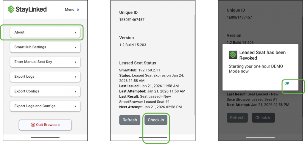 The mobile device will check in with SmartHub, learn its seat has been revoked, and enter DEMO Mode.