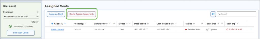 Our seat count now indicates ‘0 In-use’ and a selection for ‘Delete Expired Assignments’ appears.