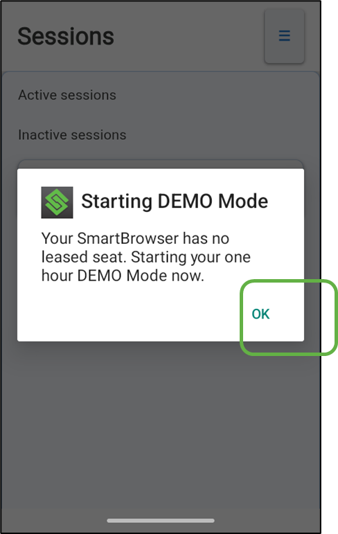 Without a leased seat, SmartBrowser runs in DEMO Mode. DEMO Mode provides a 1-hour usage period, with reminder prompts at 10 minutes and 5 minutes before the session ends. When the DEMO period expires, all sessions close and SmartBrowser must be restarted to continue.