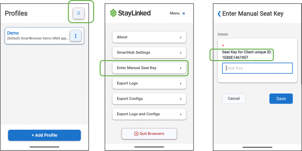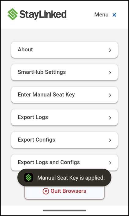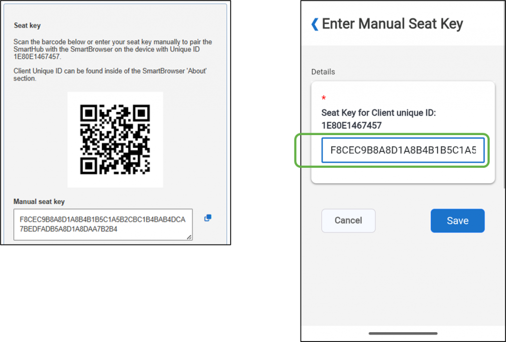 The key information can be manually entered into the Seat Key input field in SmartBrowser or we can scan the QR code with the mobile device to enter the information. The QR code can be saved as an image and printed or it can be scanned directly from your browser screen.