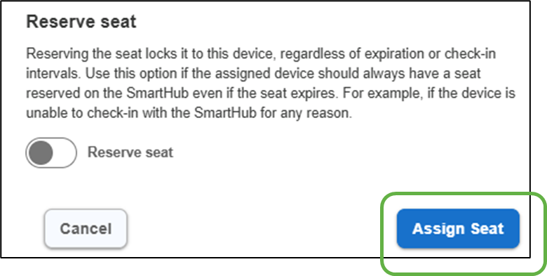 - A reserved seat ensures that license capacity in SmartHub is set aside for the designated device.