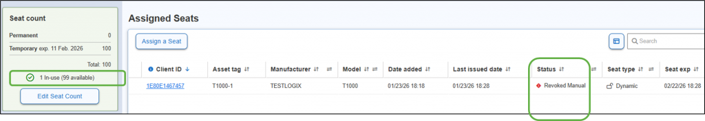 Note that although the status of this seat shows ‘Revoked Manual’ our Seat count below still indicates '1 In-use'.